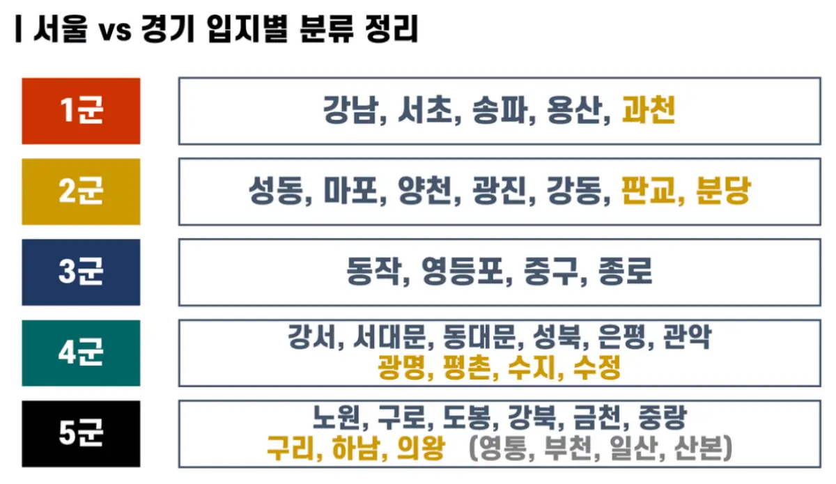 아래에서 등급을 결정하는 요소들에 대해서 구체적으로 다루겠지만 1군으로 가면 갈수록 사람들이 좋게 생각하는 대부분의 것들이 충족된다. (교통, 직장, 학군, 환경)