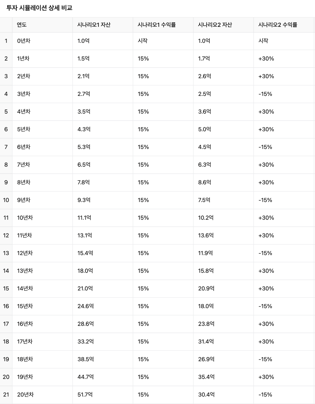 - 시나리오 1: 매년 꾸준히 15% 수익률 달성